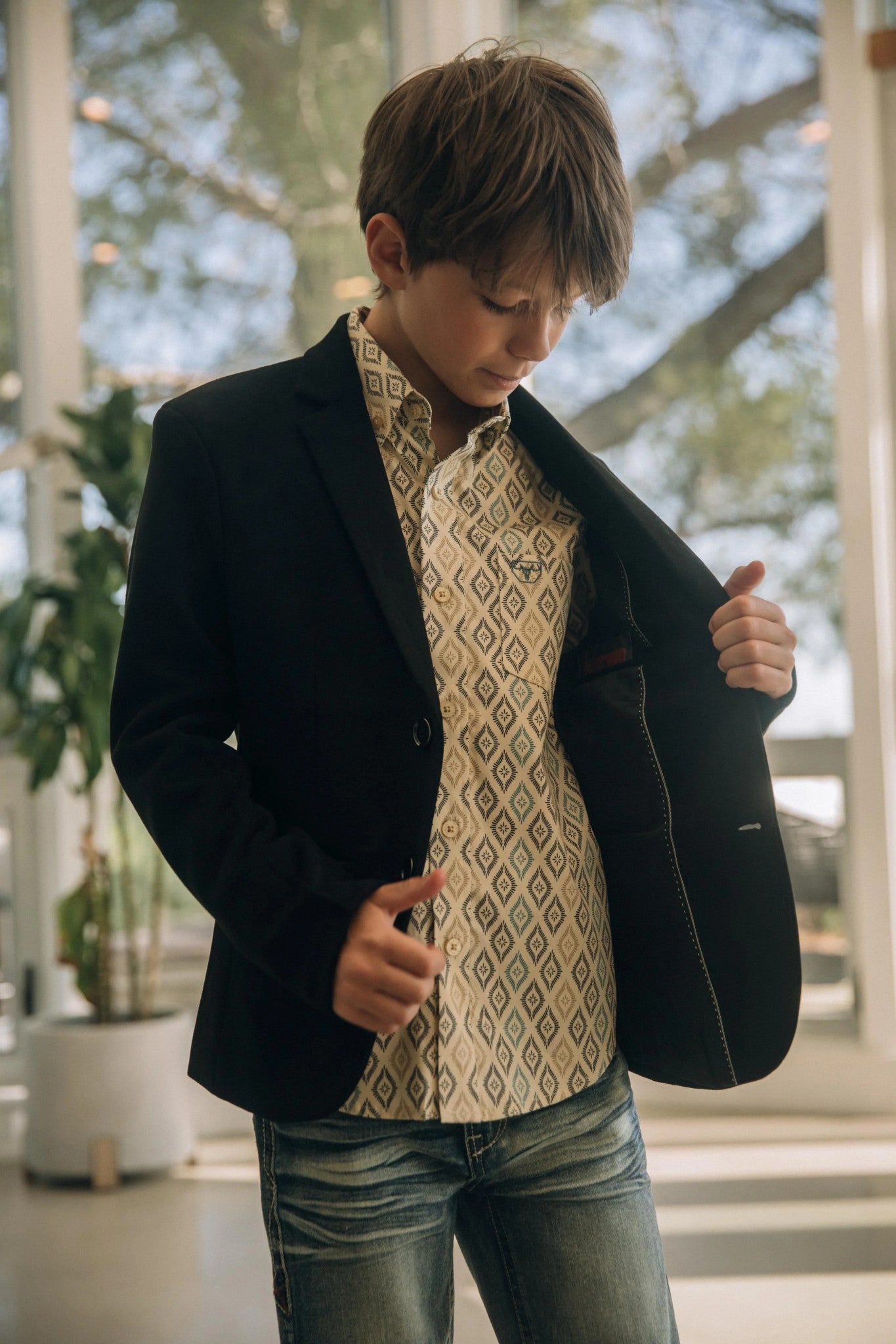 Easy to dress up with chinos and a button-down or dress down with jeans and boots, this boys’ black blazer is a versatile piece for his wardrobe.