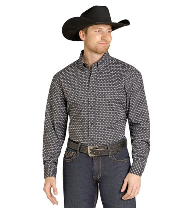 Featuring this black & white geometric printed shirt, with black buttons, 97% cotton, 3% spandex, & the Re-Flex Technology Stretch. Featuring the Rock & Roll logo on the left chest pocket.