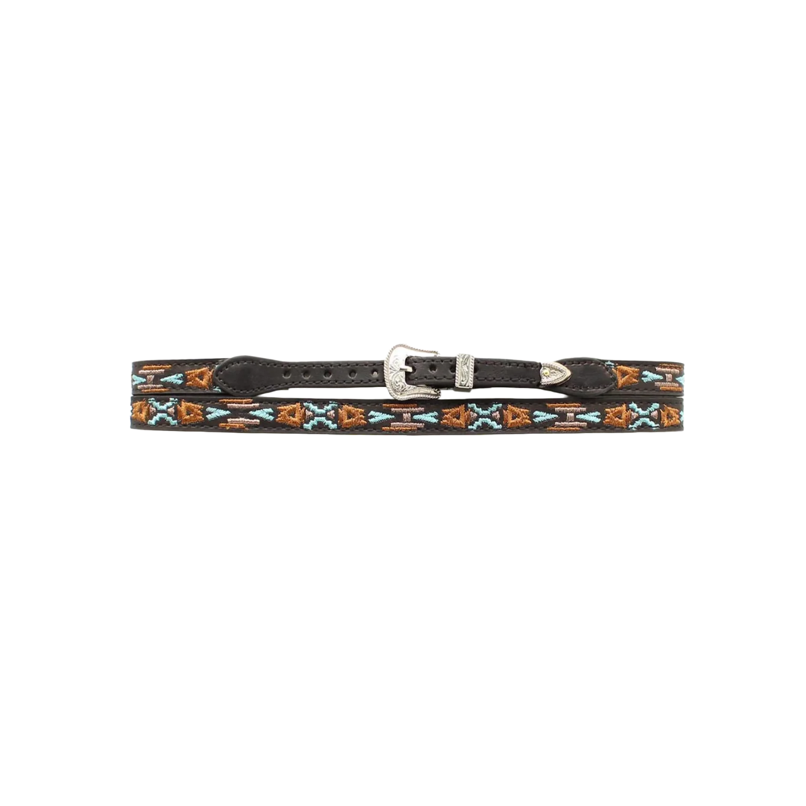 Looking for a unique and fashionable accessory for your hat? Look no further! This Twister Black Leather Hat Band with Aztec Embroidery features stylish rust, pink, and sea foam green stitching that will give your hat a subtle and trendy pop of color.