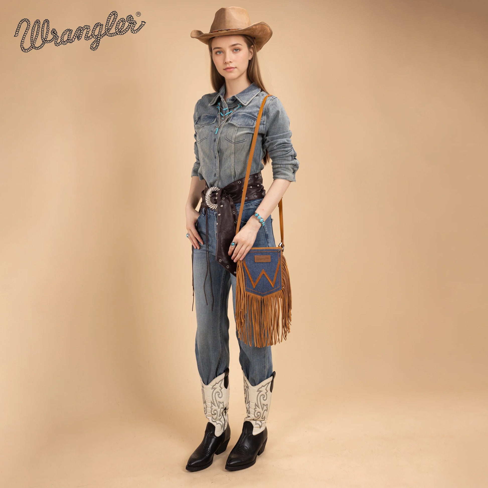 Wrangler Leather Fringe Jean Denim Pocket Crossbody - Light Brown WG367-8360LBR